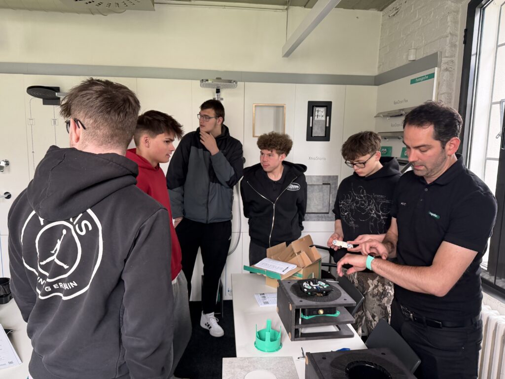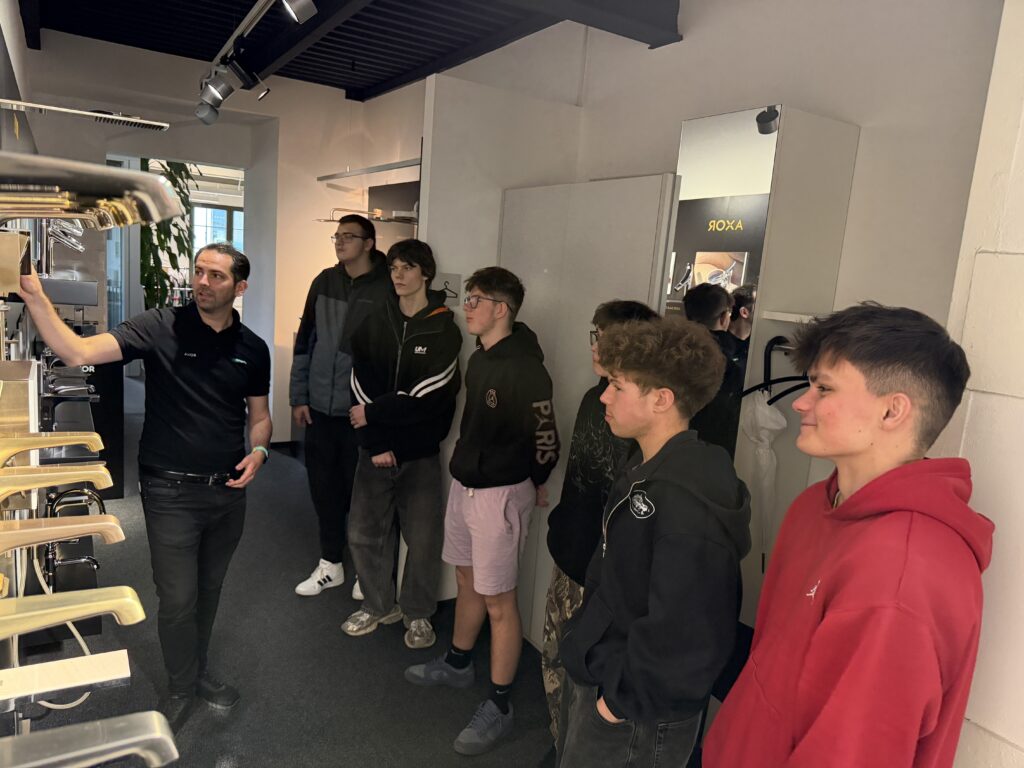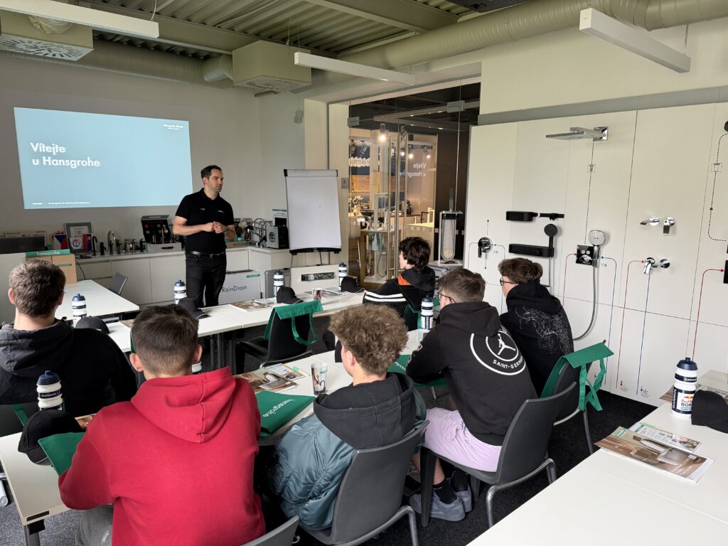 Dne 14. 4. 2026 studenti 2. ročníku oboru instalatér navštívili společnost Hansgrohe CZ v Brně. Zde jim byly prezentovány prémiové kuchyňské a koupelnové baterie.