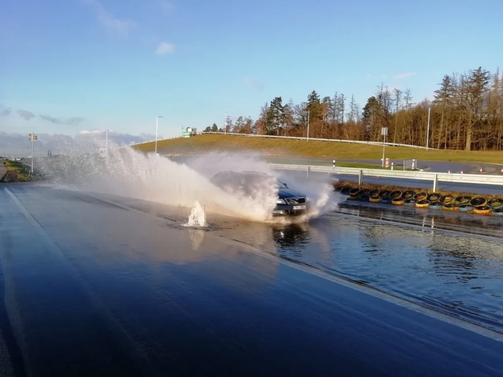 - rovina s kluznou plochou – krizové brzdění, slalom, test brzdných drah, vyhýbací manévr