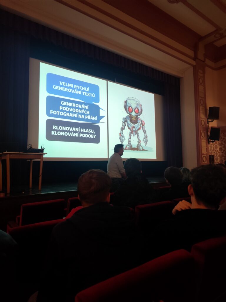 Po projekci následovala moderovaná diskuse s Pavlem Schweinerem z projektu E-Bezpečí. Diskuzi vedla moderátorka, která se studenty otevřela témata bezpečnosti na internetu, rizik spojených se zneužitím osobních dat i nutnosti kriticky přistupovat k informacím, které nám technologie a umělá inteligence předkládají. Bylo patrné, že studenty téma zaujalo a vedlo je k zamyšlení.